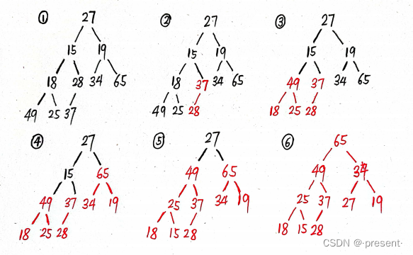 28和37不是一个大堆,那就用AdjustDown调整为一个大堆.