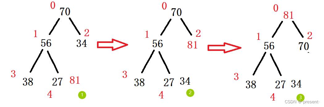 因此,我们只需要将新插入的数(81),沿着它祖先,逐一进行调整,直到最后形成一个大堆,便可
