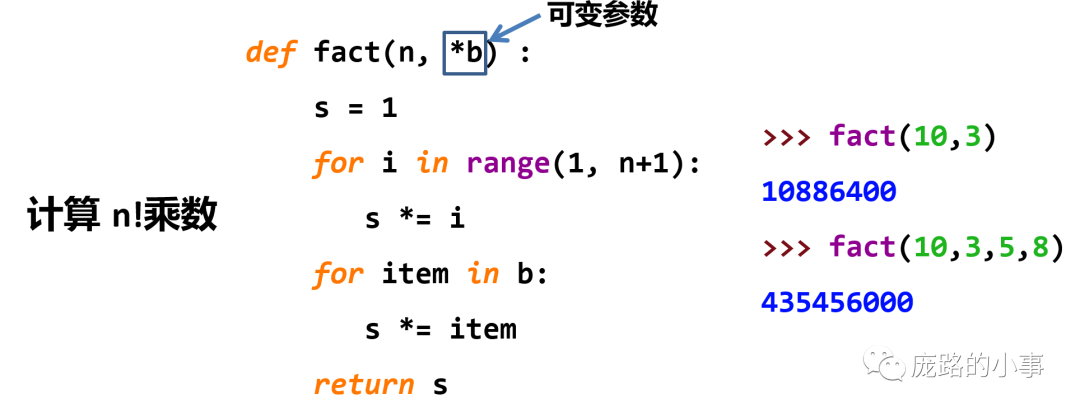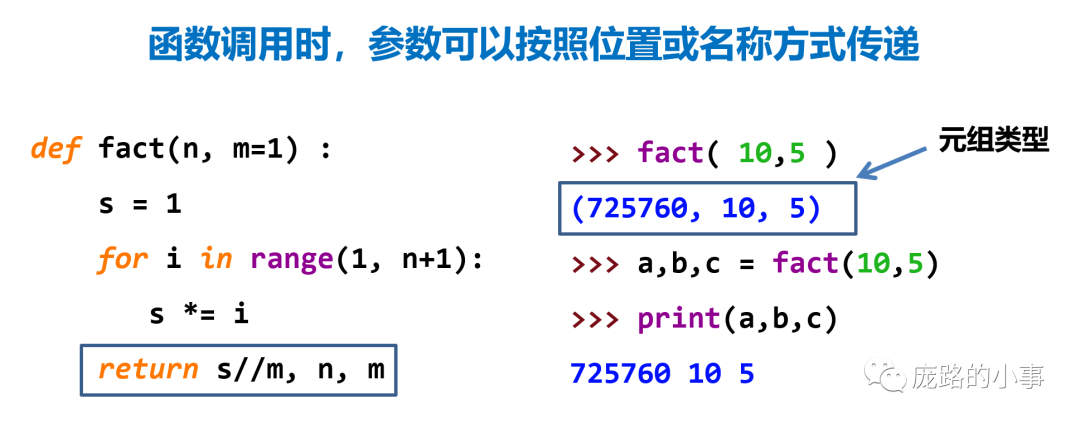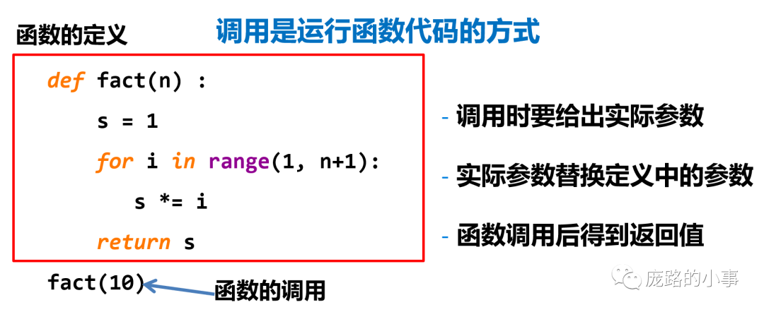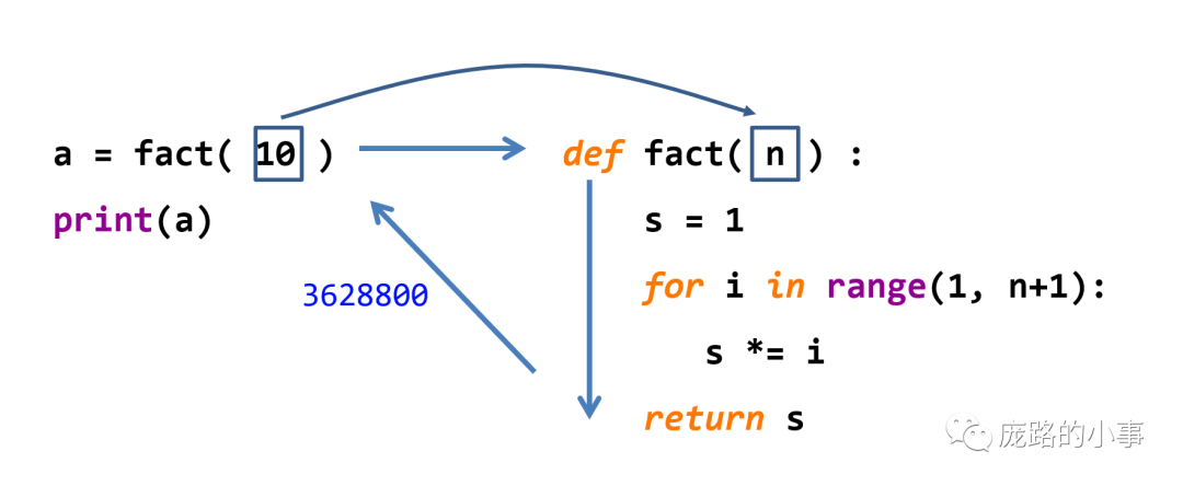 在这个阶乘的函数中,n就是形参,10就是实参,fact(10)就是函数调用的语句,return表示这个函数的输出就是s的值,关于实参和形参如何传递,计算结果如何传递,看下面这张图