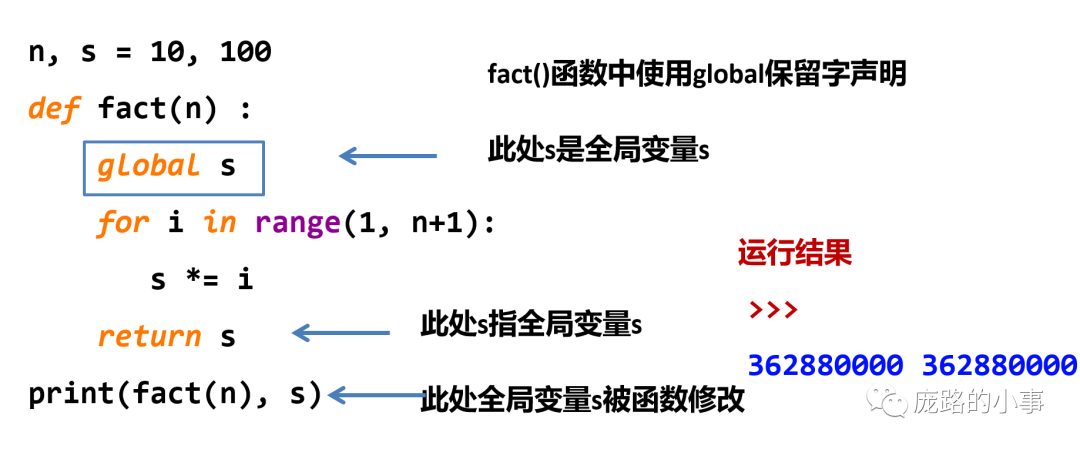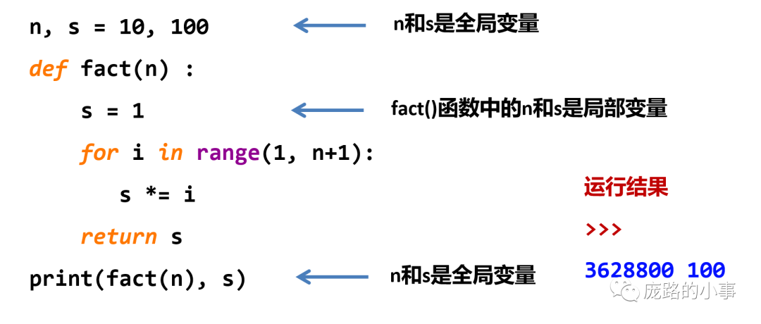 在上面这个例子中,n和s不在函数fact()中和在fact()中时是完全不同的定义,在函数中时局部变量,在函数外是全局变量