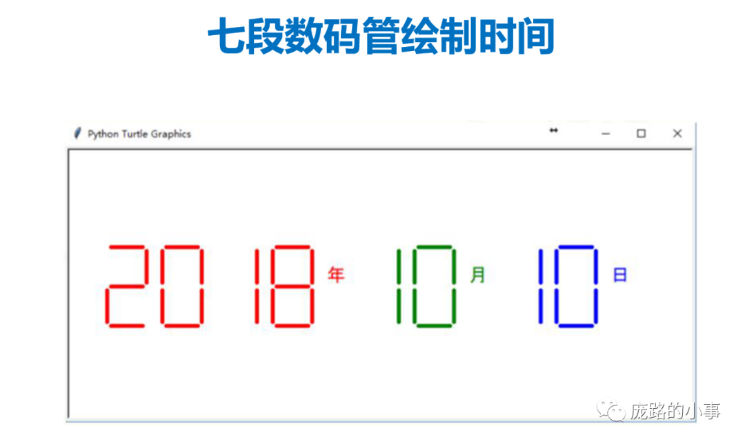 def drawLine(draw):   #绘制单段数码管turtle.pendown() if draw else turtle.penup()turtle.fd(40)turtle.right(90)