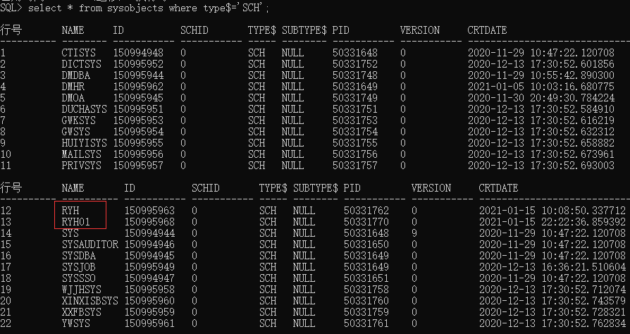 执行:select * from sysobjects where type$='SCH';可以查询当前数据库下所有模式,图中标红的为创建用户ryh和ryh01时系统自动创建的模式