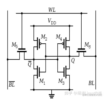 SRAM只要储存器保持通电,里面储存的数据就可以保持不变。我们也把它叫做双稳定态,即使有干扰,当干扰消除的时候,电路就会恢复稳定值。它的每个单元都是由六个晶体管电路来实现。如下图。