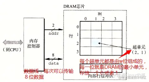 DRAM芯片中的单元被分成d个超单元,每个超单元都由w个DRAM单元组成。一个d*w的DRAM总共就是存储dw位的信息了。(在这里我觉得《深入理解计算机原理》的作者翻译有问题,本书很多地方的翻译都让人读的不够顺畅,这里的有三个‘单元’,其实可以完全还另外一种说法,简单的说就是一个块被分成d个组,每个组都是w个DRAM单元。)超单元被组织成r行c列的长方形阵列,这里d=rc。每个超单元都有形如(i,j)的地址,这里i表示行,j表示列。如下图。