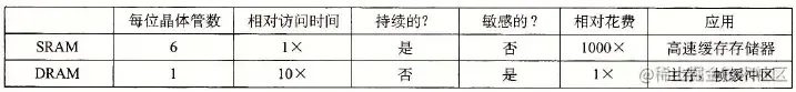 DRAM每个单元是由一个电容和一个访问晶体管组成的,每一位存储就是对一个电容充电。利用电容内部存储电荷的多少来代表这一位是0还是1。但是由于电容有漏电的现象,当有干扰存在时,可能会导致电压被扰乱,从而使数据丢失。所以它需要周期性的充电。由于多种原因导致的漏电,DRAM单元会在10~100毫秒时间内失去电荷。例如由于电容暴露在阳光下会导致电压的改变,利用这一特性,数码相机和摄像机的传感器本质就是DRAM的单元阵列。下表是SRAM和DRAM的对比。