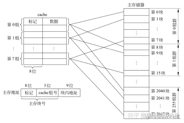 为了解决上面的问题,提出使用“组相联”的方式。组相联的主存-cache对应关系见下图。