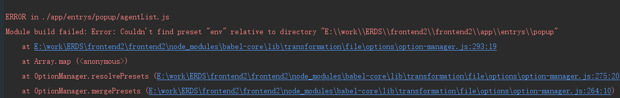 Module build failed: Error: Couldn't find preset "env" relative to directory "E:\\work\\ERDS\\frontend2\\frontend2\\app\\entrys\\popup"
