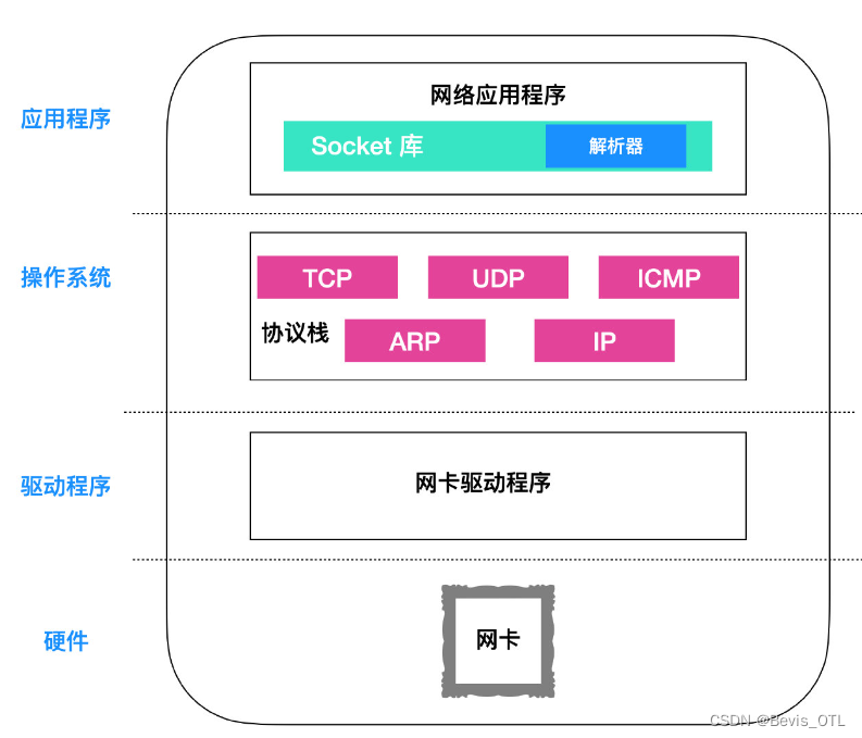 应用程序的下面就是操作系统,操作系统内部包括协议栈,操作系统下面就是网卡驱动程序,网卡驱动程序负责控制网卡硬件,网卡驱动程序驱动网卡硬件完成底层收发工作。这一系列分层的逻辑就很像公司的管理模式,领导要开发一个 APP(应用层),会通过秘书(Socket)把它交给项目经理(操作系统),项目经理通过驱动程序(管理规范)使硬件(程序员)完成开发工作。