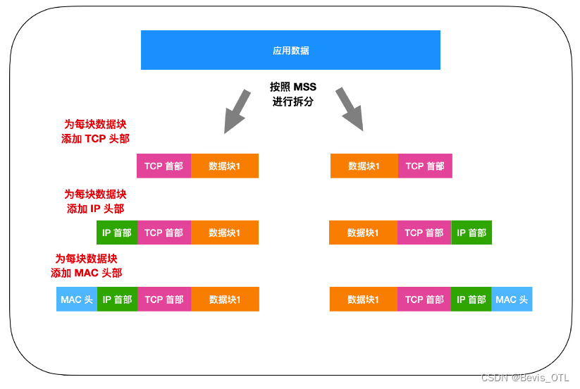 在这种情况下,发送缓冲区中的数据就会超过 MSS 的长度,发送缓冲区中的数据会以 MSS 大小为一个数据包进行拆分,拆分出来的每块数据都会加上 TCP,IP,以太网头部,然后被放进单独的网络包中。
