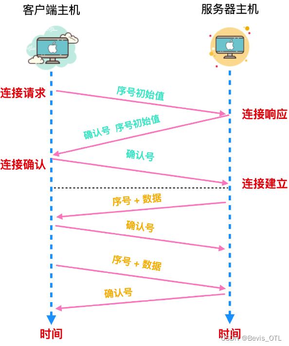 首先,客户端在连接时需要计算出序号初始值,并将这个值发送给服务器。接下来,服务器通过这个初始值计算出 确认号并返回给客户端。初始值在通信过程中有可能会丢弃,因此当服务器收到初始值后需要返回确认号用于确认。同时,服务器也需要计算出从服务器到客户端方向的序号初始值,并将这个值发送给客户端。然后,客户端也需要根据服务器发来的初始值计算出确认号发送给服务器,至此,连接建立完成,接下来就可以进入数据收发阶段了。