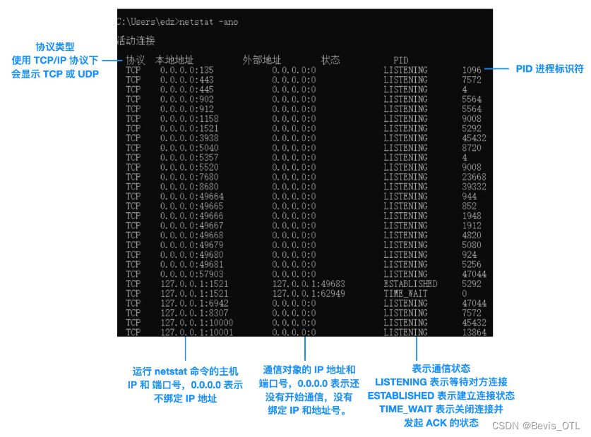 比如图中的第一行,它的协议就是 TCP,本地地址和远程地址都是 0.0.0.0(0.0.0.0 表示通信还没有开始,IP 地址暂时还未确定),而本地端口已知是 135,但是远程端口还未知,此时的状态是 LISTENING,LISTENING 表示 TCP 正在等待与远程主机建立连接,最后一个元组是 PID,即进程标识符,PID 就像我们的身份证号码,能够精确定位唯一的进程。我们可以通过 Win 下的任务管理器和 Mac 下的活动监视器来查询 PID。