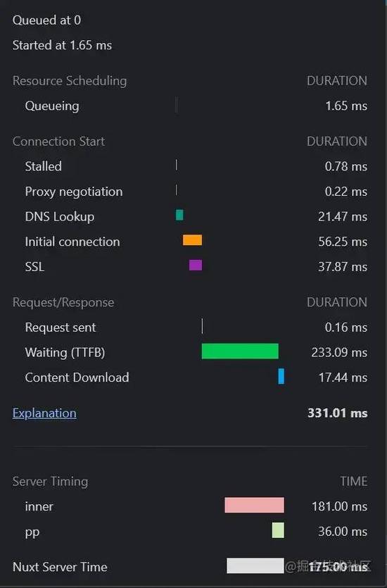 如上图,排队用了1.65ms,DNS查询用了21.47ms,initial connection(进行TCP握手的时间)用了56.25ms,SSL握手的时间用了37.87ms,然后又用了100多ms第一个字节到达我们的电脑(TTFB - 上面的查询/建立),接收整个文档花了17ms。