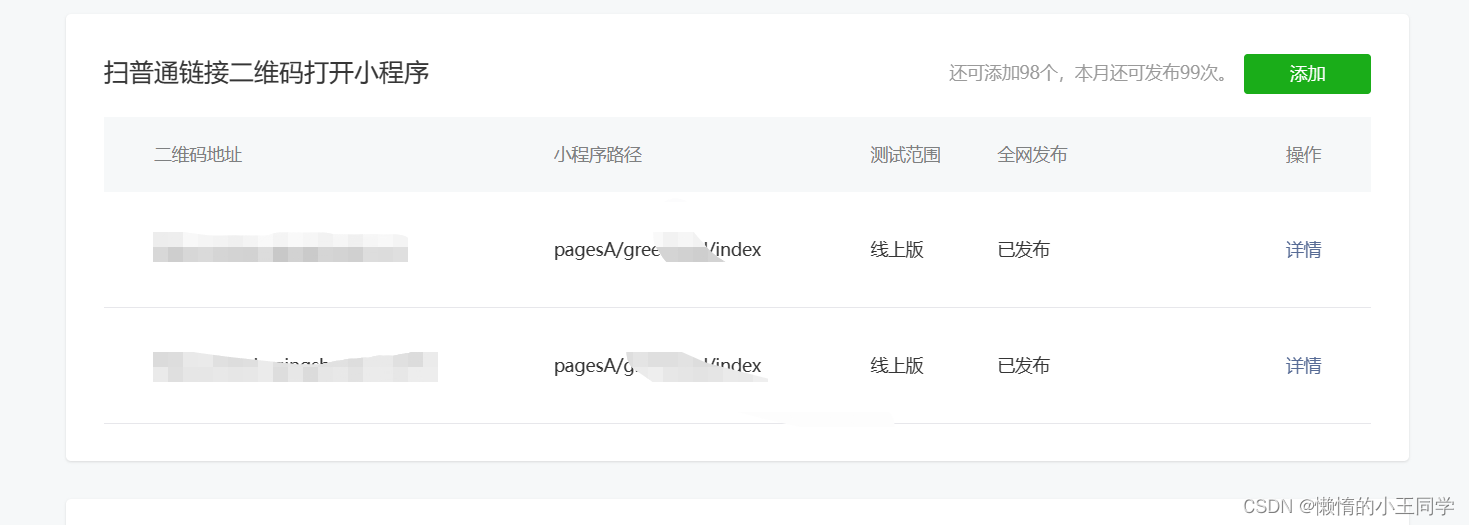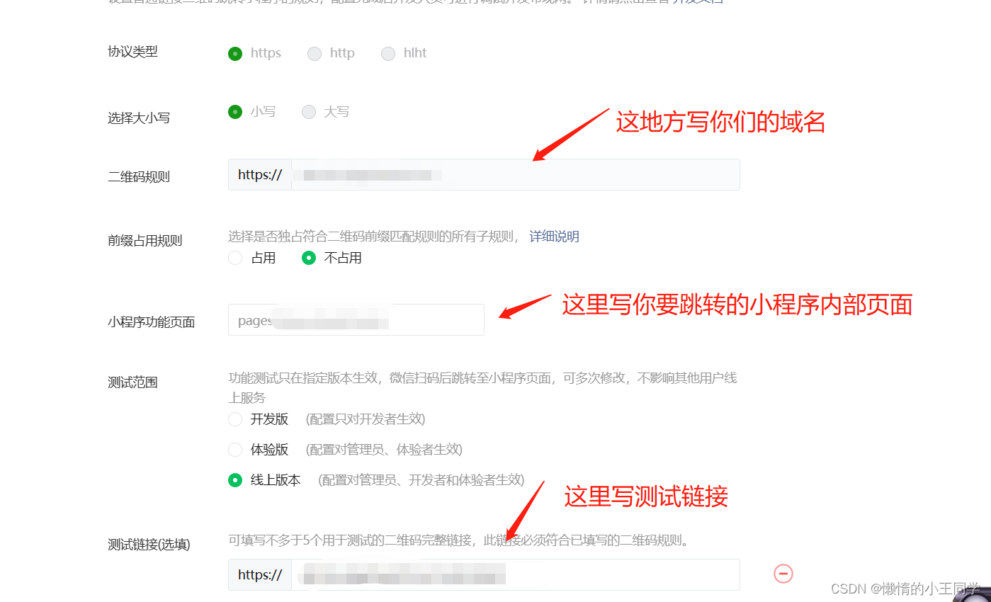 1.4 配置普通二维码链接 点击右上方添加按钮后进入此页面,测试范围,开发版本,体验版本,线上版本这个不用多说了