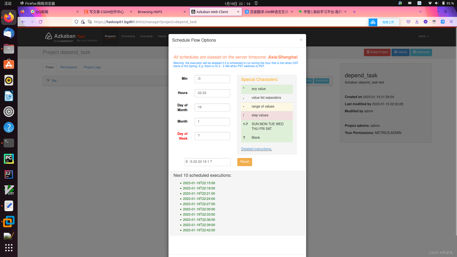 这里 Schedule 用于进行任务定时执行设置,Execute 用于任务的立即执行。这里点击 Schedule ,对其进行配置。 其中五个选项分别表示,分钟、小时、某个月的哪一天、某个月,某一天的哪周。