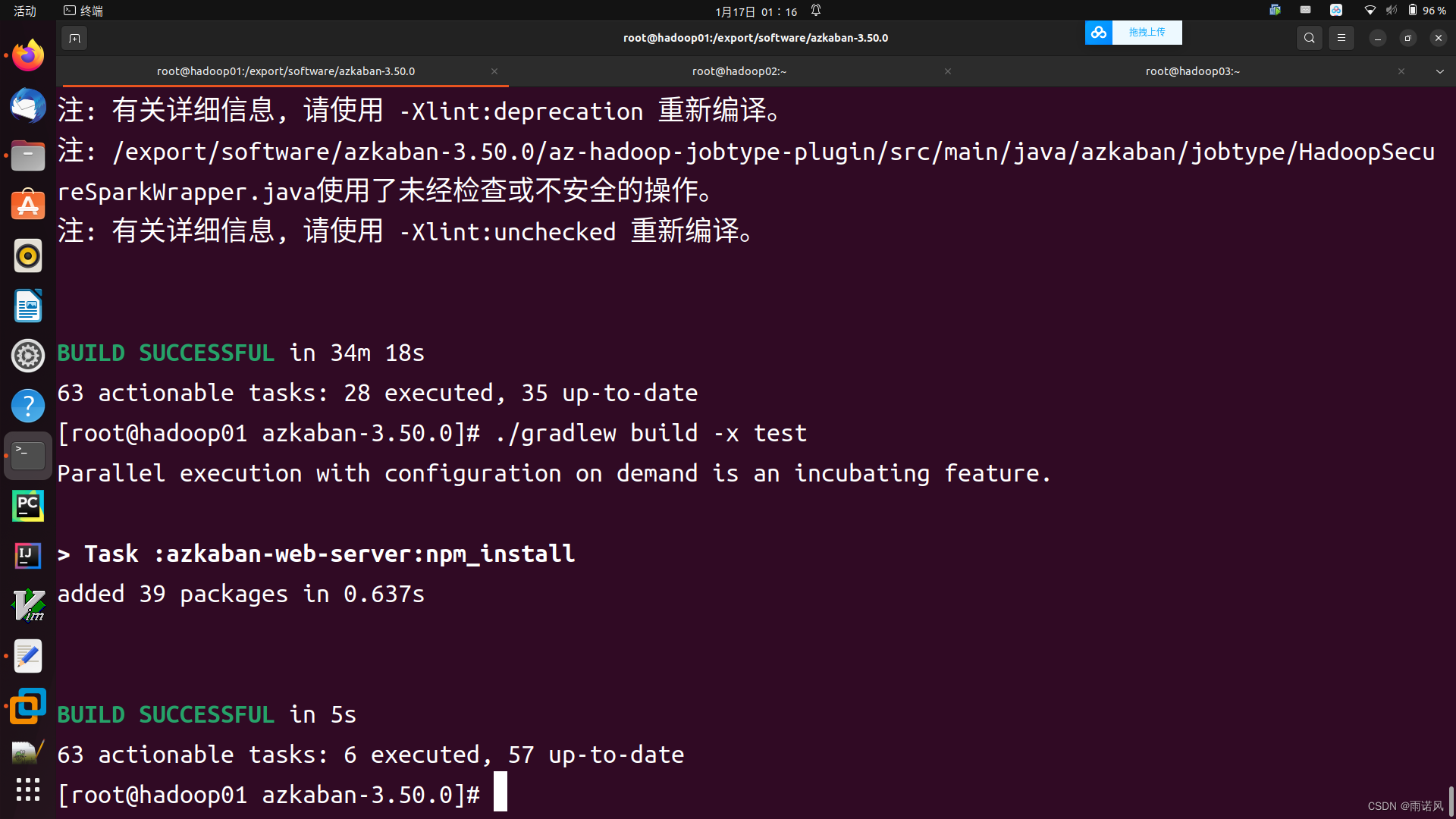 ./gradlew build -x test这里需要注意,上述指令会跳过 Azkaban 源文件的测试类部分进行自动编译构建(使用 ./gradlew mild 指令会对整个源文件全部进行编译),整个过程需要联网,如果网络不好会非常耗时连接中断时需要多次重试。执行上述指令进行编译,经过一段时间后必须看到 BUILD SUCCESSFUL 信息才可确定 Azkaban 源文件编译成功,