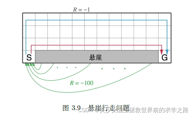 游戏规则:智能体从出发点S 出发,到达目的地G,同时避免掉进悬崖(cliff),每走一步就有−1 分的惩罚,掉进悬崖会有−100 分的惩罚。掉进悬崖游戏不会结束,智能体会回到出发点,游戏继续,直到到达目的地结束游戏。智能体需要尽快地到达目的地,为了到达目的地,智能体可以沿着例如蓝线和红线的路线行走。