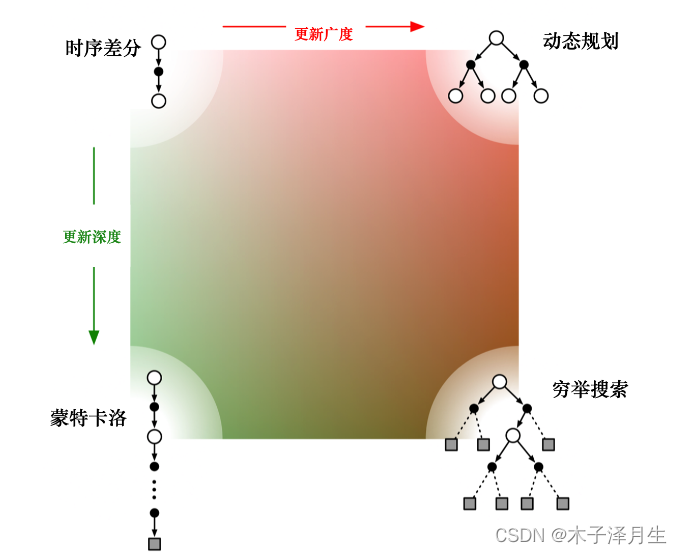 上面几个图表明,时序差分在更新时:如果把深度拓展到无穷,或者说拓展到回合结束,就变成了蒙特卡洛。如果把探索的广度拓展(即在初始时探索到所有可能的状态),就变成了动态规划。如果在深度和广度上同时扩展,也就是涉及到所有时刻所有可能的动作,此时就变成了穷举搜索。