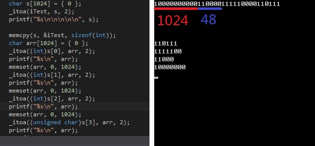{ST_INT stTest;stTest.m_A = 1;stTest.m_B = 3;stTest.m_C = 6;stTest.m_D = 0;stTest.m_E = 63;stTest.m_F = 48;stTest.m_G = 1024;int iTest;memcpy(&iTest, &stTest, sizeof(int));char s[1024] = { 0 };_itoa(iTest, s, 2);printf("%s\n\n\n\n\n", s);memcpy(s, &iTest, sizeof(int));char arr[1024] = { 0 };_itoa((int)s[0], arr, 2);printf("%s\n", arr);memset(arr, 0, 1024);_itoa((int)s[1], arr, 2);printf("%s\n", arr);memset(arr, 0, 1024);_itoa((int)s[2], arr, 2);printf("%s\n", arr);memset(arr, 0, 1024);_itoa((unsigned char)s[3], arr, 2);printf("%s\n", arr);scanf(arr);return 0;
