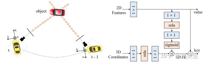 a 左:t-1帧到t帧的坐标转换 右:特征引导的位置编码器(FPE)