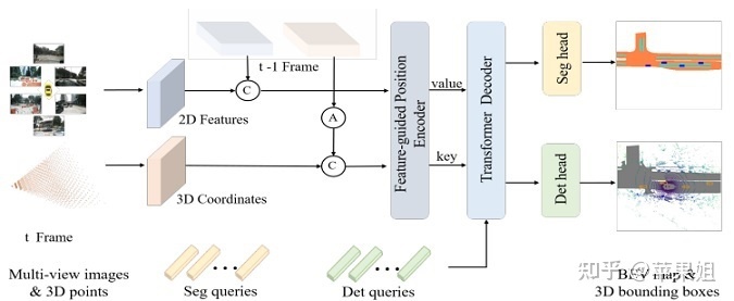 PETRv2是在PETR的基础上进一步使用了时序特征、特征引导的3D位置编码和语义分割query,也是孙剑大佬离世前的项目(忧伤)。