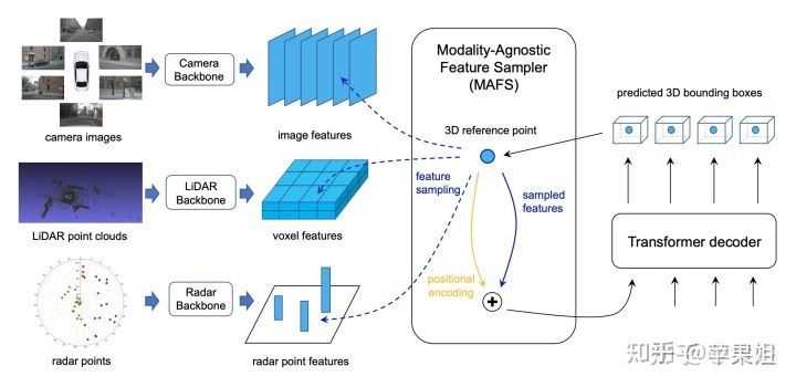 FUTR3D可以支持任意传感器,如2D摄像机、3D激光雷达、3D雷达和4D成像雷达等,只需要对不同的传感器配置不同的特征提取backbone即可。整体框架参照DETR3D,通过object queries得到3D reference points,再与多个传感器特征进行交互,最后同样适用匈牙利匹配的方式计算损失。感慨BEV的各种框架让原本很复杂的多视角图像特征融合、多传感器特征融合变得如此容易!