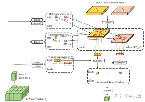 看代码会发现,BEVFormer的参考点和采样点的获取方式也和DETR3D有很大的不同,由于BEVFormer是稠密的,不需要额外去预测一些备选参考点,而是直接得到固定的H*W*Z个参考点坐标(Z代表每个bev pillar中设定的不同高度的参考点个数),再将所有参考点投影到N个2D视图中,得到N*H*W*Z个2D参考点,而采样点(与2D参考点的offset)是通过bev queries去预测的,每个bev query预测N*Z*K个采样点,也就是直接从3D的query预测每个2D视图的offset。DETR3D就简单的多,直接从object queries预测N个参考点,再做多视图投影,并与多视图的2D参考点处的特征做交互,没有引入采样点。(看得头疼)