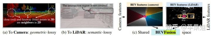 由于任何传感器都具有局限性,所以目前自动驾驶到落地量产阶段必须要做的就是多传感器融合。对于激光雷达和摄像头两种重要的传感器来说,传统的特征融合方法主要有两种:Lidar-to-camera和Camera-to-lidar。然而,前者损失了lidar的几何结构信息,难以用于3D目标检测等任务,后者损失了camera的语义信息,难以用于语义分割等任务,如下如所示。经过本文的介绍大家可以想到,将多种传感器都投影到bev空间是一个有效的特征融合方式,可以同时保留lidar的几何结构信息和camera的语义信息。BEVFusion[15]即是一种有效的多模态特征融合框架。