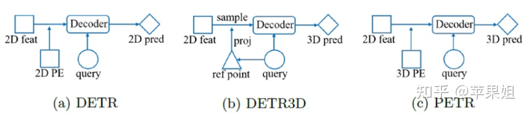 所以,PETR摒弃了采样和投影,直接计算2D多视图对应的3D位置编码,并加到2D图像特征中,再和3D的object queries进行交互,直接对3D object queries进行更新,大大简化了pipeline。DETR/DETR3D/PETR的对比图和PETR结构图如下所示: