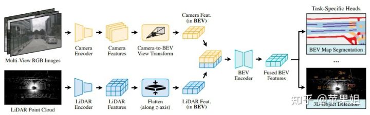 BEVFusion框架非常直观,照相机和激光点云数据经过各自的encoder进行特征编码后,camera特征采用LSS的自底向上的方法进行bev视角转换,lidar特征直接沿着z轴展平即得到bev特征,再将二者特征拼接后输入BEV encoder进行BEV特征编码,即得到融合后的BEV特征,来支持下游多任务。