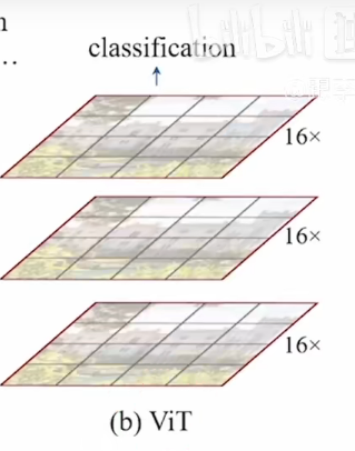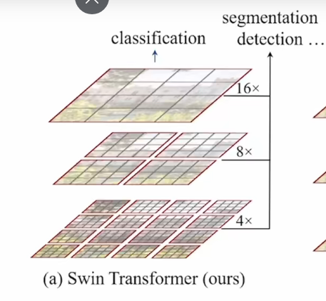 b图作者先说Vision Transformer将图片达成patch,因为Vit中patch 为16*16的,所以说16*就是16倍的下采样率,那么就是说这里的每一个patch/token它自始至终代表的尺寸都是差不多的,都是16倍的下采样率,虽然说它可以通过全局的自注意力操作达到全局的建模能力,但是他对多尺寸特征的把握就是弱一点,但是对于下游视觉任务比如检测和分割来说,多尺寸的特征是至关重要的,对于目标检测应用最广泛的一个就是说, 当你有一个分层式的卷积神经网络之后,每一个卷积层出来的特征出来的感受都是不一样的,