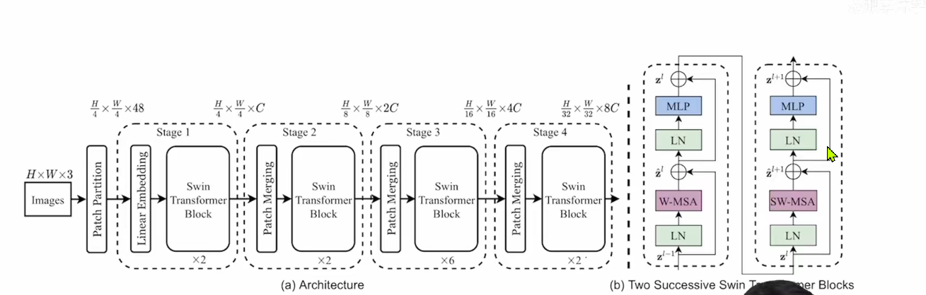 首先对输入的一张图片 进行patch 假设一张图片为224*224*3 patch后变成 56*56*48 其中*48是因为 是RGB3通道 又,H/4,W/4,故4*4*3=48, 接下来进行linear Embedding就是将这个向量的维度设置为我们预先设置好的值,就是这个Transformer能够接受的值,他把这个超参数设置为96,所以这个时候输入尺寸就又变成了56*56*96,然后他又会拉直变成了3136*96的序列长度,然后这个96就变成了每一个token这个向量的维度, 这个swin TransformerBlock 是基于窗口来算注意力的 ,,,patch Merging 是一个上采样的方式, 各一点采一个样