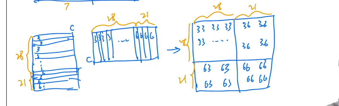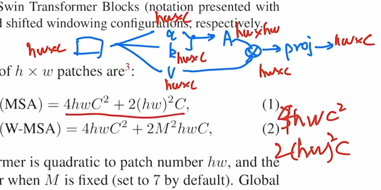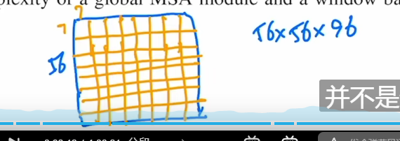 切成橘黄色的窗口,但是橘黄色的窗口并不是最小的计算单元,(最小的计算单元还是之前的那个patch),现在所有的自注意力的计算都是在这个小窗口里面完成的,序列长度永远都是49, 56/7=8; 8*8=64,也就是说在这个64个窗口里面分别去结算他们的自注意力, 以多头自注意力为例子: