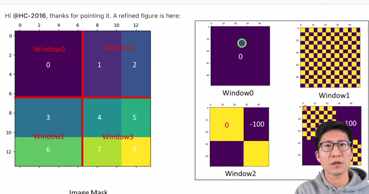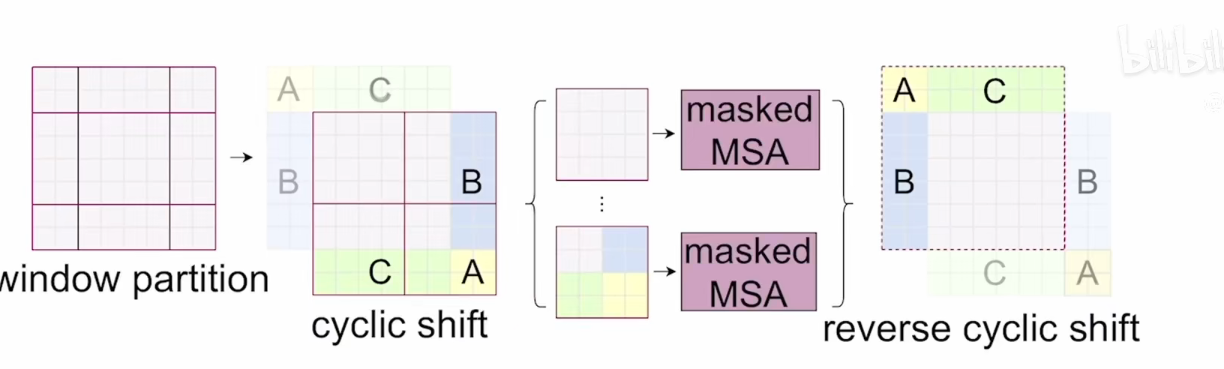 将A,C直接移动下面来,左边的B移动到右边的B, 那么这个时候移位之前的窗口数为4个,那么循环移位后得到的窗口就也变成了4个,那这样窗口的数量固定了,也就是说现在计算的复杂度也固定了.但是仍然存在问题,虽然对于中间的窗口来时,它里面的元素都是紧挨着的,他们之间可以两两的去做这个自注意力机制,但是对于剩下的窗口来说,是从远远的搬过来的,按道理来讲是不可以进行自注意力的,就是他们之间也没有太大的联系, 此时,就提出了掩码,做完掩码后再将循环位移还原回去 具体的掩码方式, 经过循环位移之后得到的