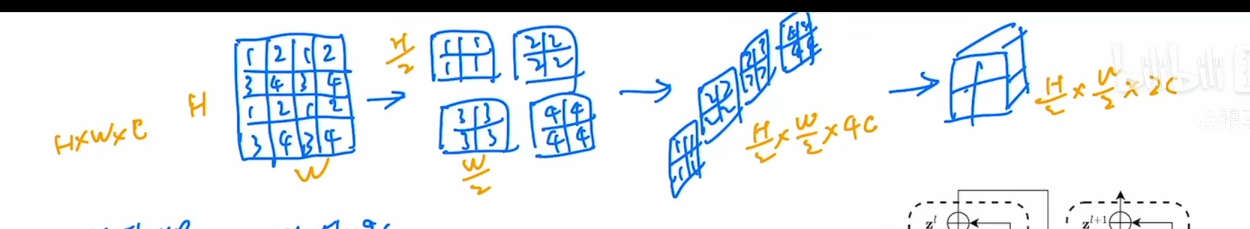 原来的1个张量 就变成了4个张量, 每个张量的大小就变成h/2,w/2 就是用空间上的维度去换了更多的通道数,通过这样的操作就将一个大的张量就变小了(卷积神经网络的池化操作),但是池化操作后 它的通道都会翻倍,比如从128变成了256,256再变成512, 这里我们在做了一个操作,紧接着 又做了一个操作就是在c 的这个维度上,它用一个1*1的卷积,将c降下来变成了一个2c,,