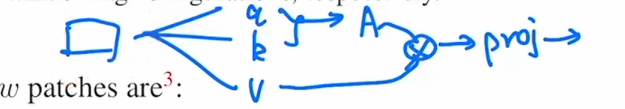 比如说现在输入一张图片,这个自注意力就是说先把这个图片变成q, k,v三个向量,(这个过程就是原来的三个向量分别乘了三个系数矩阵)然后一旦得到,q,k后他们就会做一个相乘,然后就会得到这个Attention也就是这个自注意力的这个矩阵,然后A再和v做一次加权,然后再做一个projection.