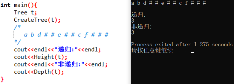 } int main(){Tree t;CreateTree(t);/*a b d # # e # # c f # # #*/cout<