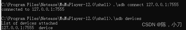 3. 手动连接adb,找到木木模拟器的安装位置,shell文件夹,打开cmd,按照下面两个步骤执行