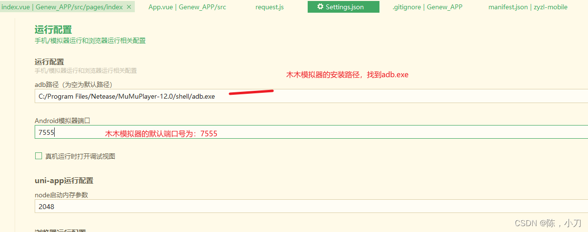2. 配置adb的路径,找到木木模拟器的安装路径,默认的端口号为:7555