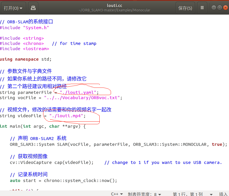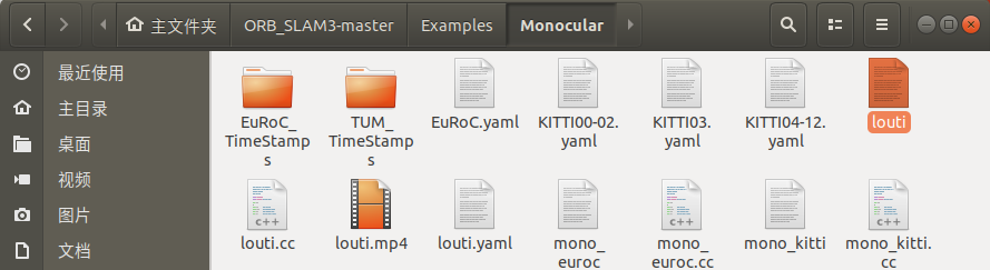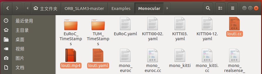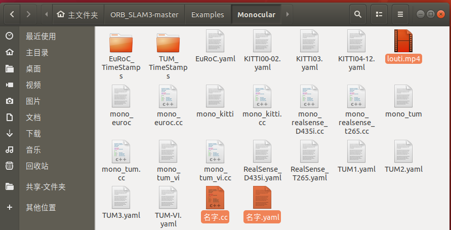 将 视频文件(mp4即可) 名字.cc名字.yaml 放入Monocular文件夹修改后两个文件的名字修改.cc文件内容修改Cmakelist.txt文件内容删除Build文件夹重新编译ORB_SLAM3在Monocular里出现可执行文件。运行./xxxxxx即可