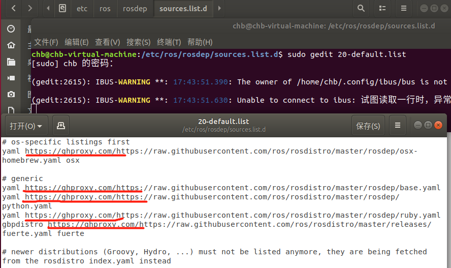 首先确定 sudo rosdep init 是否成功,是否在如下目录下生成此文件:/etc/ros/rosdep/sources.list.d/20-default.list,若没有,可从其他配置成功的电脑上拷贝过来;修改/etc/ros/rosdep/sources.list.d/20-default.list文件在所https://raw.githubusercontent.com前加上