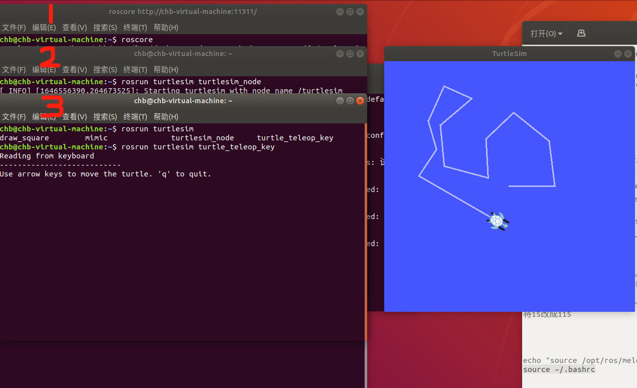 检测ROS是否安装成功,依次 1输指令,运行。。 2输指令,运行。。 3输指令,运行。。 把鼠标放在第三个终端里,通过键盘↑↓←→能控制小乌龟运动即可,表明完成了第二大步ROS的安装!!!!!(每次打开第二个节点生成的乌龟都是随机的,QWQ)