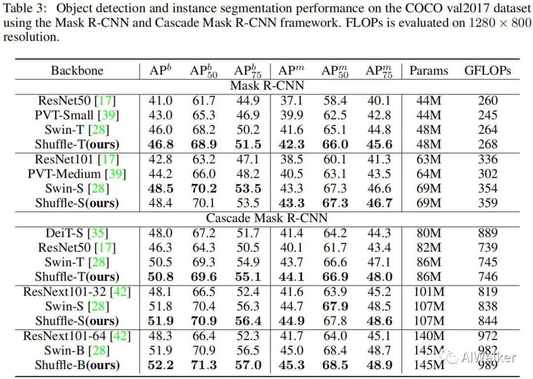 在Mask R-CNN框架下,Shuffle-T与Shuffle-S大幅超过了其他ConvNet与Transformer方案(包含DeiT、PVT-Medium);