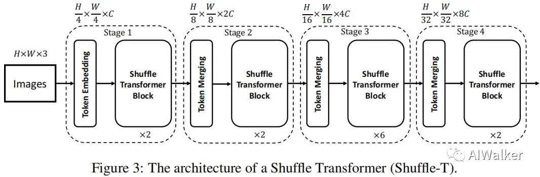 上图给出了所提Shuffle Transformer的架构示意图,注:此为tiny版本。Shuffle Transformer包含一个词嵌入层、多个STB以及词合并层。在我们的实现中,我们采用两个堆叠卷积作为词嵌入层。为生成分层表达,我们采用了stride=2,kernel=2的卷积作为词合并层以减少词数量。