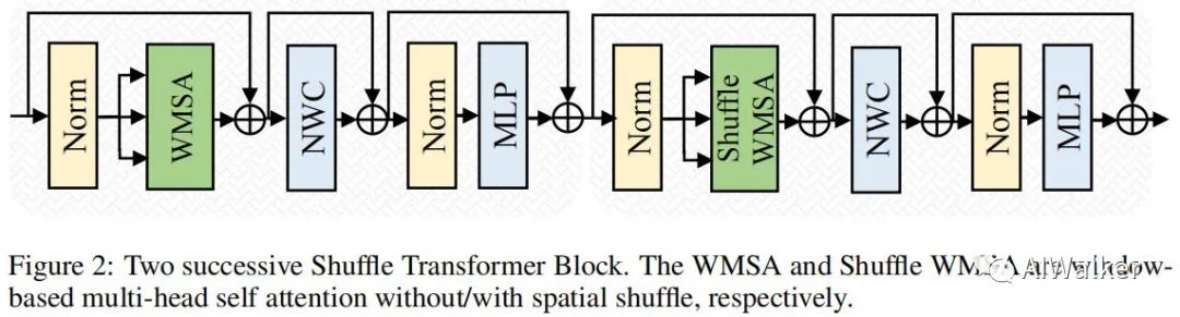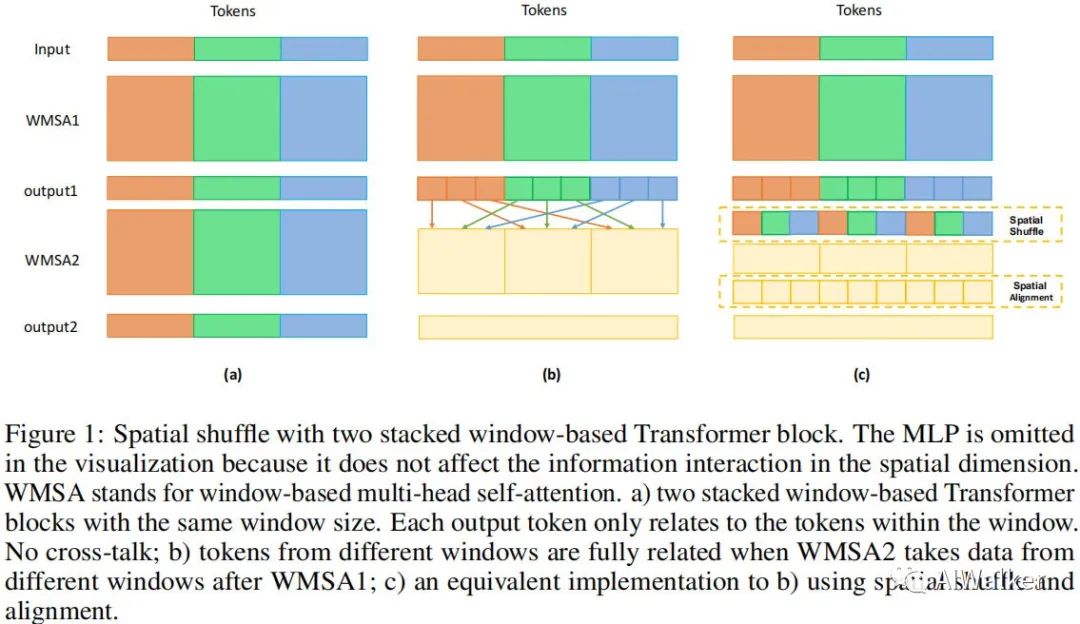 为解决该问题,最直接的一种方案是:第二个WMSA能接收来自不同窗口的输入,见上图b。受启发于ShuffleNet,我们可以铜鼓空域置换操作对上述方案进行优雅而高效实现,见上图c。