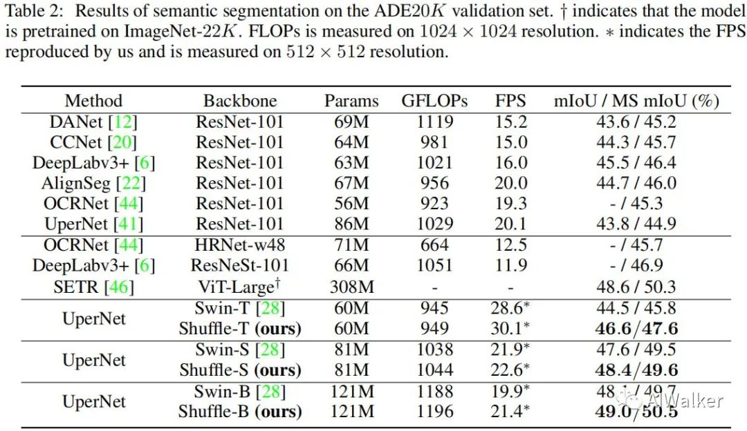 相比Swin-S,Shuffle-T取得了0.7%mIoU指标提升。