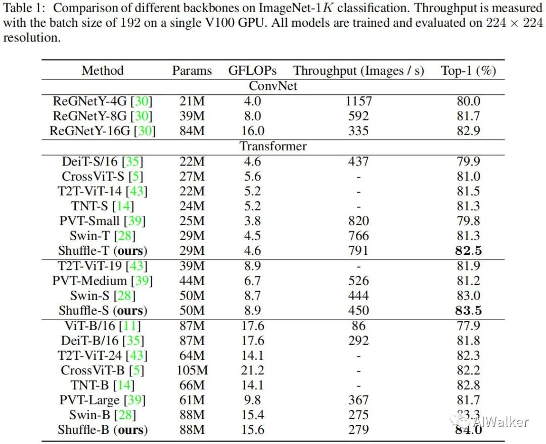 为公平对比,我们参考了Swin的配置。我们所构建的基线模型Shuffle-B具有与Swin-B/ViTB/DeiT-B相当的模型大小以及计算复杂度。我们同时还引入了Shuffle-T与Shuffle-S,它们分别与Swin-T、Swin-S相当。窗口尺寸默认为7,每个头的query维度为32,每个MLP的扩展层为 。本文所提模型的超参分别如下:
