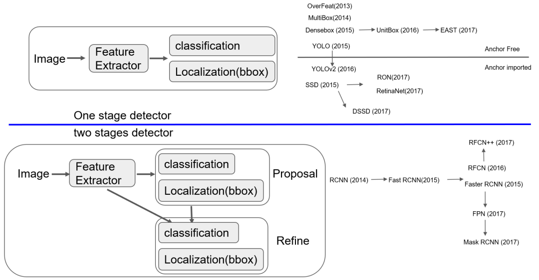 2013年-2014年是基于深度学习的物体检测飞速发展的阶段,主要分成两类:一种是one stage,代表作有Densebox、YOLO、SSD以及RetinaNet等,另一种是two stage,代表作有RCNN系列、RFCN、FPN、MaskRCNN等。