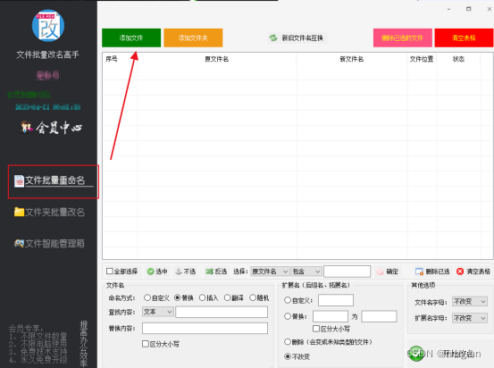 给文件替换符号我们切换到【文件批量重命名】并点击【添加文件】