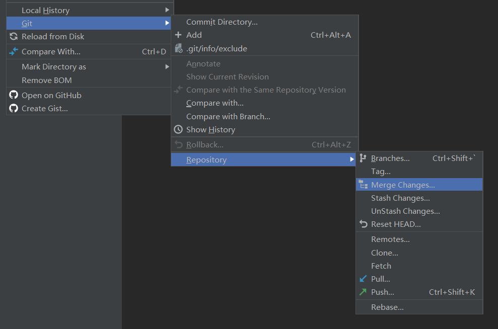 本文以 PyCharm 为例,讲解如何手动解决冲突。首先在项目文件夹右键选择 Merge Changes