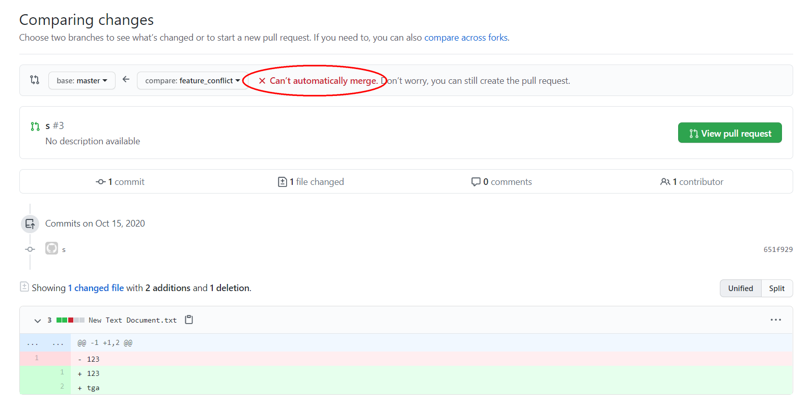 如果各个分支都提交的不同文件,Git 会自动合并。如果提交的有相同文件,就会发生冲突,无法自动合并,Git 也不知道以哪个为准,创建 pull request 会告诉你不能自动 merge